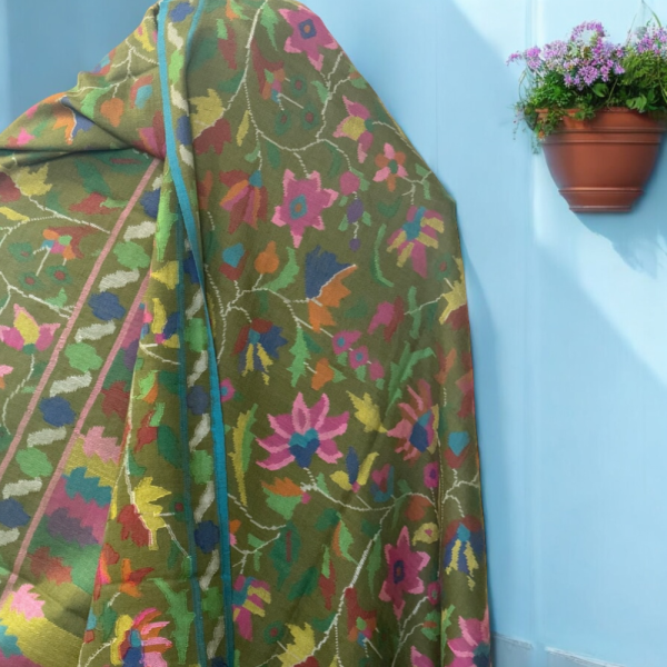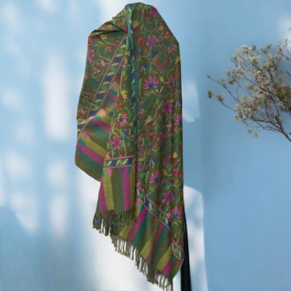 This exquisite handwoven olive green Kani Jamawar pashmina shawl features intricate patterns that highlight traditional craftsmanship. Soft and luxurious, it adds an elegant touch to both casual and formal outfits, making it a beautiful addition to any wardrobe.