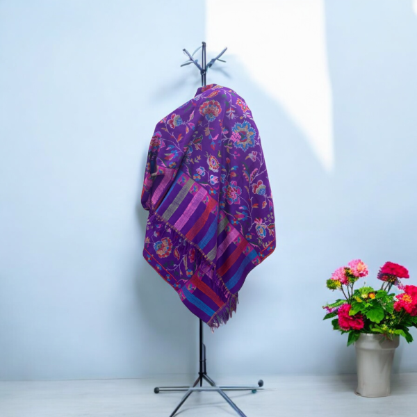 This luxurious high-end purple Kani Jamawar shawl showcases intricate patterns that reflect exquisite craftsmanship. Made from premium materials, it adds a sophisticated touch to both casual and formal outfits, making it a stunning addition to any collection.