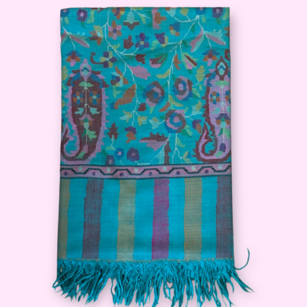 This stunning sea green Kani Jamawar shawl features intricate patterns that highlight traditional craftsmanship. Made from luxurious fabric, it offers elegance and sophistication, making it perfect for both casual and formal occasions. An exquisite addition to any wardrobe.