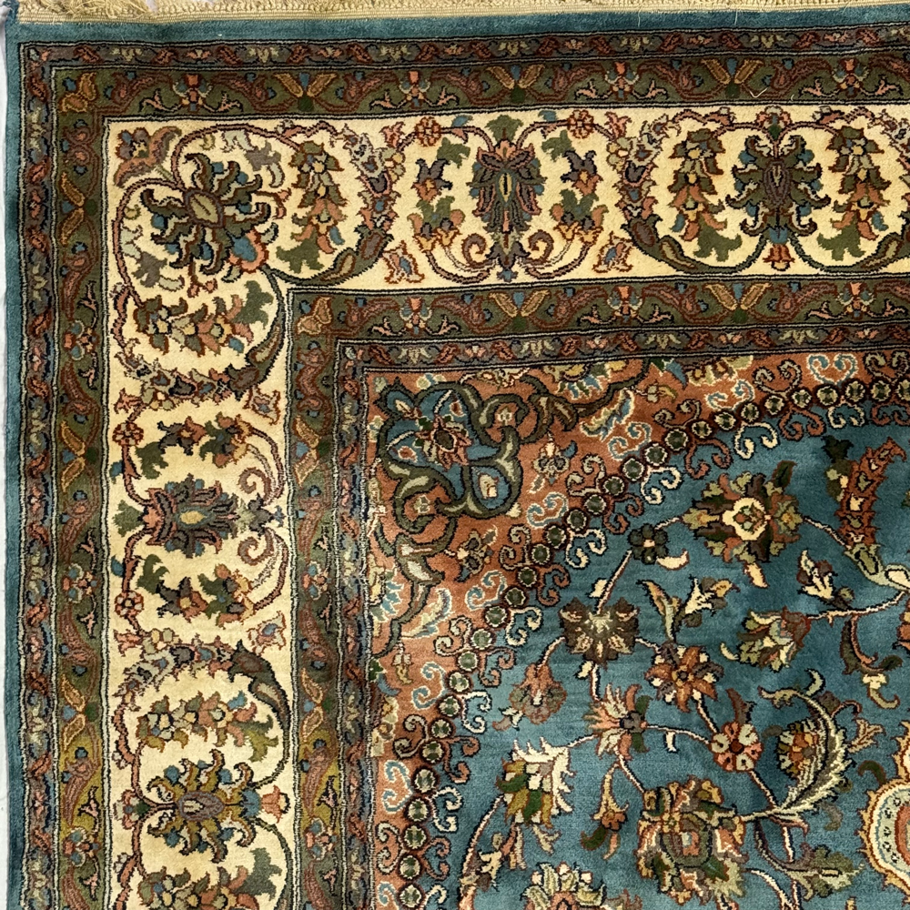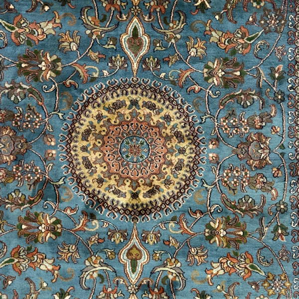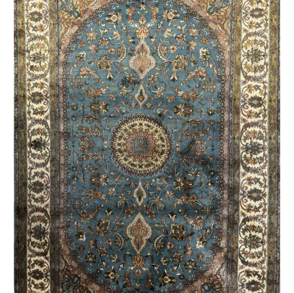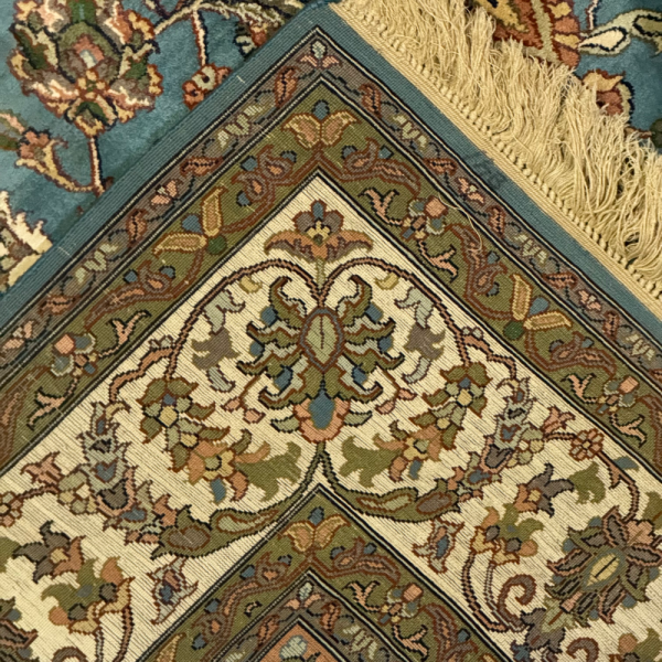 The handmade, luxurious Turkish color silk on silk carpet, sized 6 x 4 feet, features intricate designs and a vibrant palette. Its exquisite craftsmanship and soft texture add elegance and warmth to any space.